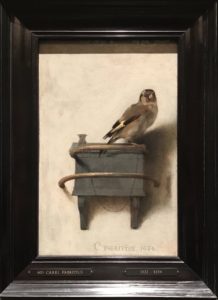 1654年10月12日に爆薬庫の爆発事故、それは多くの死者を出し、アトリエも巻き込まれ、多くのオランダ絵画が焼失した。その中の一人の、レンブラントの弟子のカレル・ファブリティウスも事故に巻き込まれて帰らぬ人となった。その中で生き残ったトロンプ・ルイユ(騙し絵)の一部、それが「ゴシキヒワ」である。私はこの一枚を見ていた。けれども、とっくに意識からは消えていた一枚だった。思いだせることは少なく、フェルメールの「真珠の耳飾りの少女」の列に大勢が並んでいた。そこに入るのに嫌気がさしながら少し逃避気分で見ていた一枚だった。